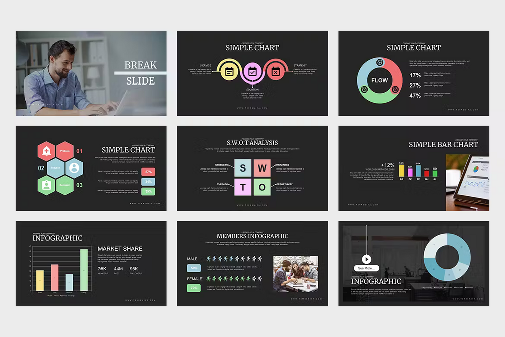 • 50 unique and editable Keynote slides design.