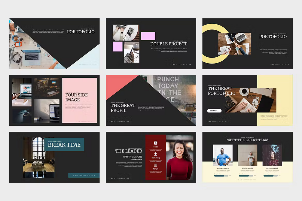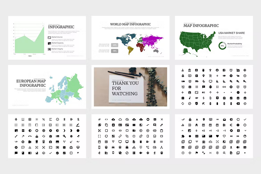 Typically, the only elements that are changed while working with a presentation template are colors, typography, copy and any visual assets such as photos for example.